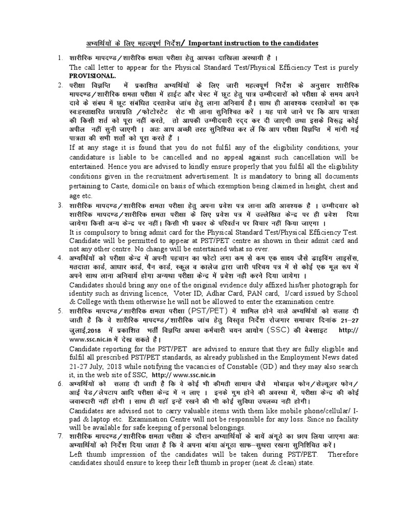 It is compulsory to bring admit card for the Physical Standard Test/Physical Efficiency Test.