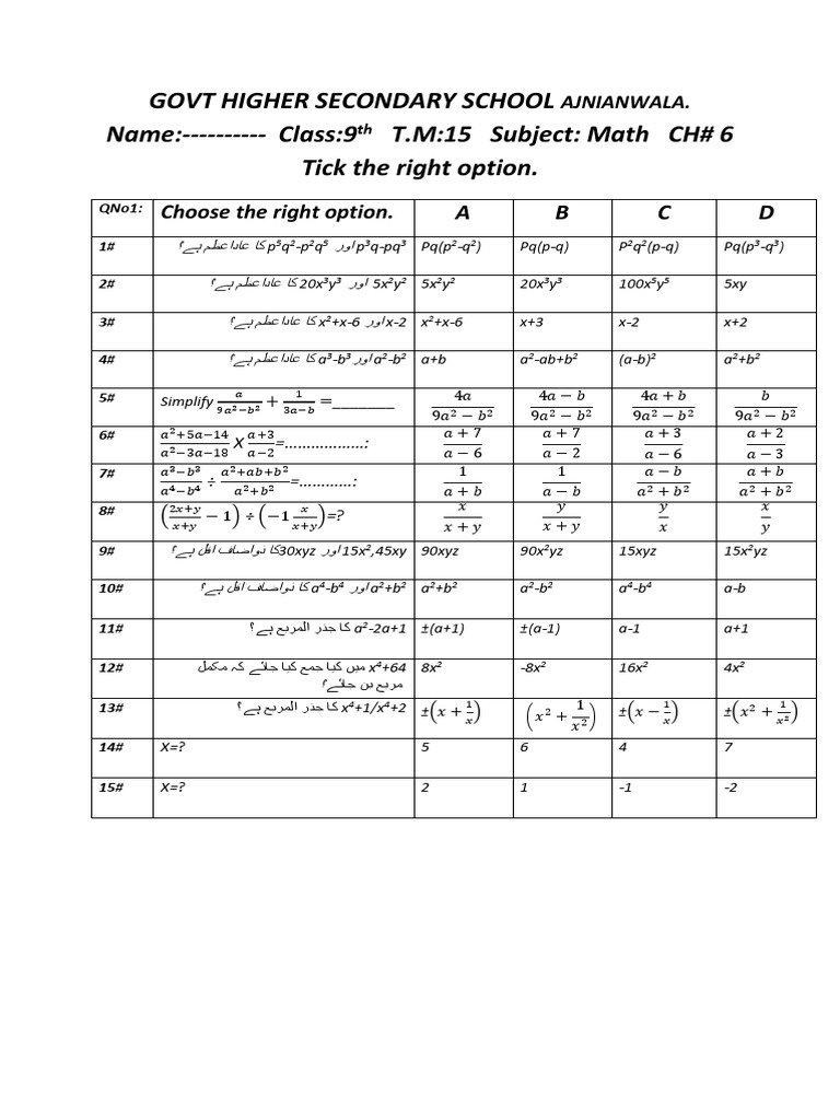 Name:---------- Class:9th T.M:50 Subject: Math CH# 6