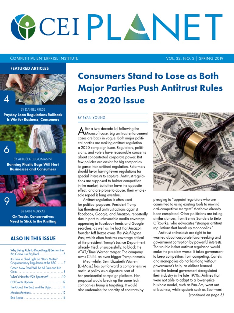 provides a sample of poli-cies where CEI experts have been focused in past few months. On the following pages you will find Ryan Young’s take on why leaders from both major par-ties have taken up the regulatory cudgel of antitrust policy. Fortunately, he and Wayne Crews provide an antidote to this zealotry in the recent CEI study, “The Case Against Antitrust Law.”Senior fellow Angela Logomasini gives us the facts about those annoying bans on plastic bags, while Myron Ebell provides essential reading on the envi-ronmental left’s latest grand plan to save the world, The Green New Deal. I can give you the shorthand: Nothing in it is new, and it certainly is no deal.If you have been wondering about all the fuss about cryptocurrency, we have you covered. John Berlau has studied the SEC’s regulatory impulse regarding this new technology and offers a help-ful overview of the issue. Also on the finance front, Daniel Press breaks down why payday loans regula-tions would hurt the consumers they aim to protect. Iain Murray reminds conservatives of the impor-tance of free trade. Senior Fellow Marc Scribner comments on the future of vehicle-to-everything communications, technologies that could enable safety-enhancing innovations like hazard warn-ings to drivers and pedestrians and high-speed automated road trains. And Senior Fellow Michelle Minton looks ahead at the future of sports gambling. CEI was a leading voice in the fight to legalize a widely accepted and popular activity that millions of American have engaged in for years. I hope you can join us on June 20 as we celebrate CEI’s first 35 years fighting for liberty. If Washington is anything like Kings Landing in the Game of Thrones’ fictional Westeros, a capital city full of power seek-ers, the CEI dinner is where you can count on finding a Night’s Watch against overzealous regulators.