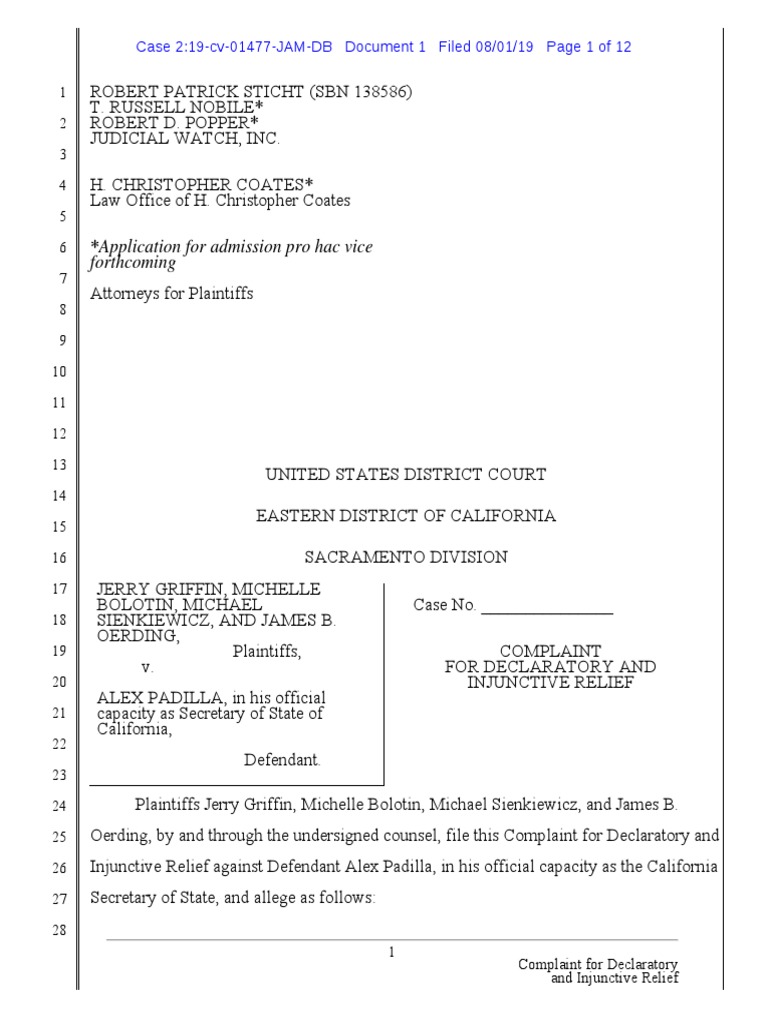Attorneys for Plaintiffs UNITED STATES DISTRICT COURT EASTERN DISTRICT OF CALIFORNIA SACRAMENTO DIVISION JERRY GRIFFIN, MICHELLE BOLOTIN, MICHAEL SIENKIEWICZ, AND JAMES B. OERDING, Plaintiffs, v. ALEX PADILLA, in his official capacity as Secretary of State of California, Defendant.Case No. _______________ COMPLAINT FOR DECLARATORY AND INJUNCTIVE RELIEF Plaintiffs Jerry Griffin, Michelle Bolotin, Michael Sienkiewicz, and James B. Oerding, by and through the undersigned counsel, file this Complaint for Declaratory and Injunctive Relief against Defendant Alex Padilla, in his official capacity as the California Secretary of State, and allege as follows: