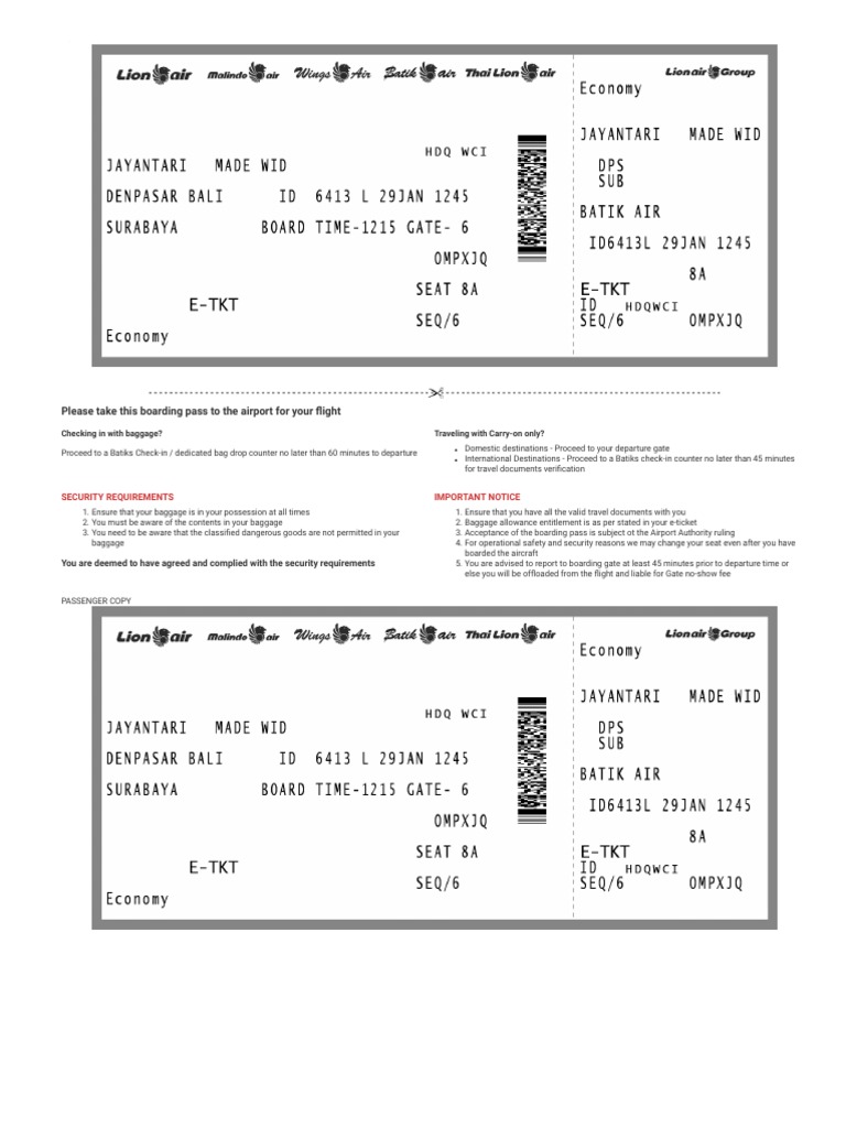 You have a flight booked with Batiks airline. If checking bags, proceed to the Batiks check-in counter no later than 60 minutes before departure for domestic flights or 45 minutes for international flights. Carry-on passengers should proceed directly to the departure gate, or for international flights the Batiks check-in counter within 45 minutes. The document outlines security requirements including keeping bags in your possession and awareness of prohibited dangerous goods, as well as important notices about travel documents and allowed baggage.