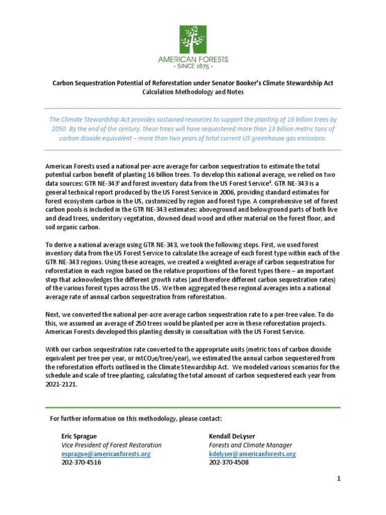 e/tree/year), we estimated the annual carbon sequestered from the reforestation efforts outlined in the Climate Stewardship Act. We modeled various scenarios for the schedule and scale of tree planting, calculating the total amount of carbon sequestered each year from 2021-2121. For further information on this methodology, please contact: