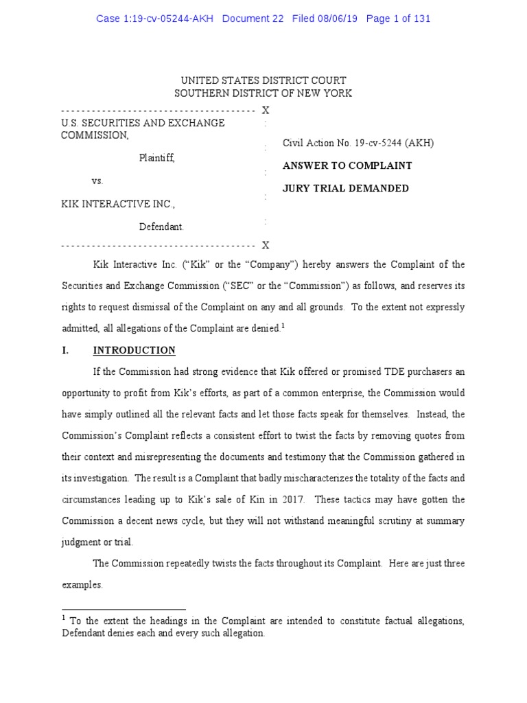“Even prior to the DAO Report, however, Kik had been informed by