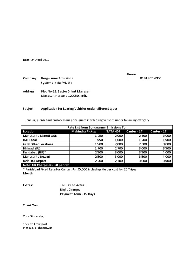 Dear Sir, please find enclosed our price quotes for leasing vehicles under following category