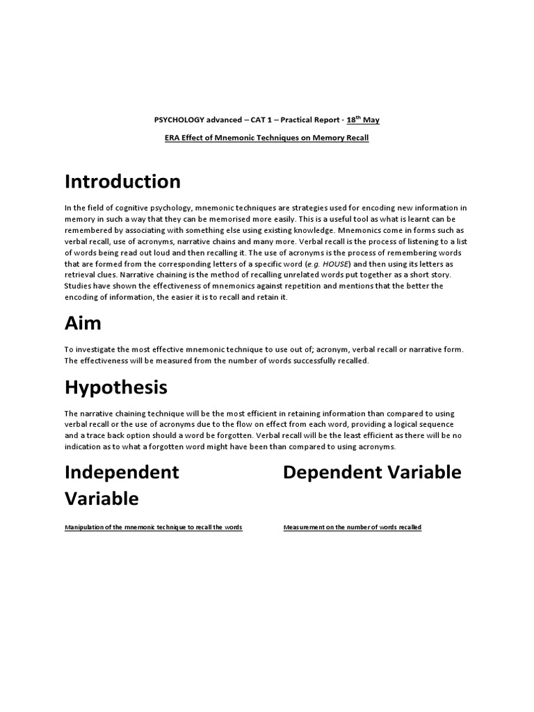1. The aim of the investigation was to determine the most effective mnemonic technique to use for