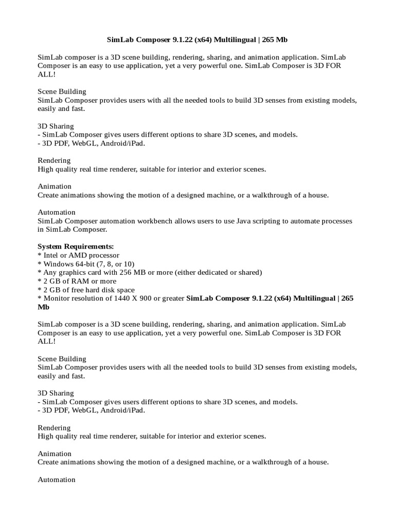 * Monitor resolution of 1440 X 900 or greater SimLab Composer 9.1.22 (x64) Multilingual | 265