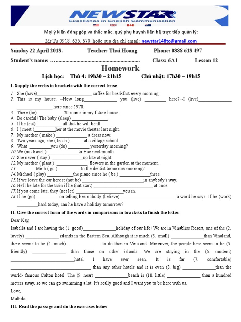 Sunday 22 April 2018. Teacher: Thai Hoang Phone: 0888 618 497