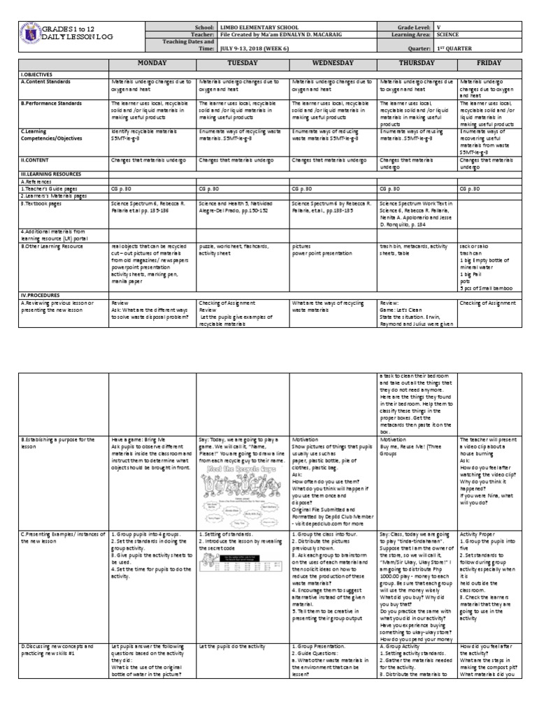 GRADES 1 To 12 Daily Lesson Log