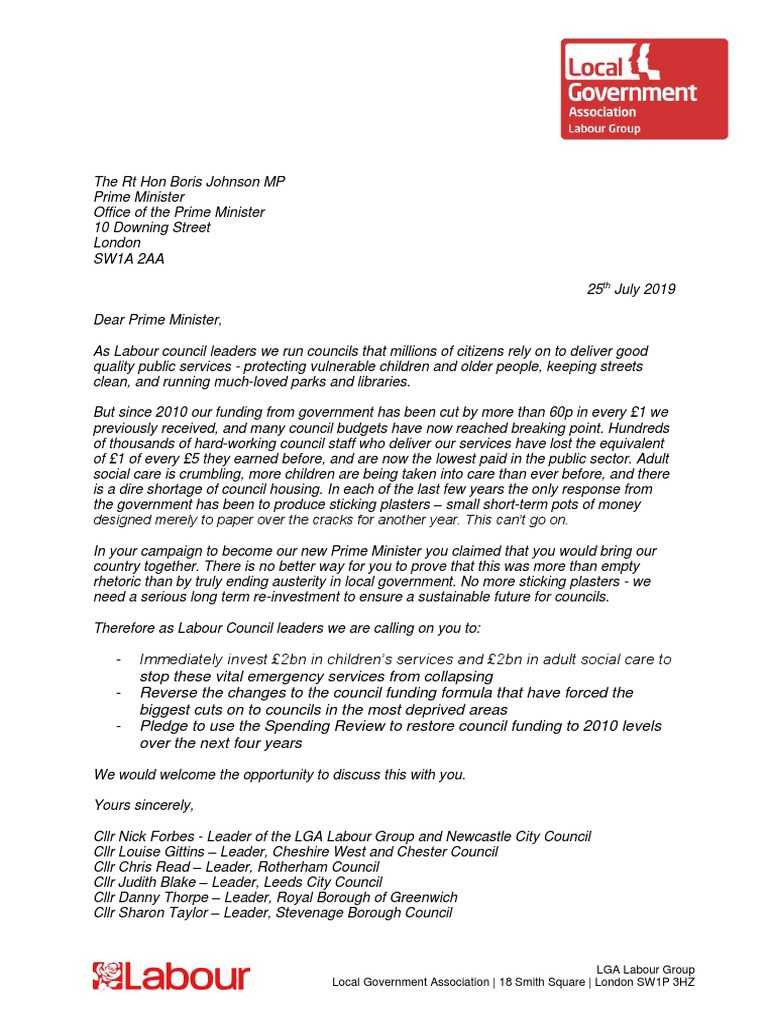 July 2019 Dear Prime Minister, As Labour council leaders we run councils that millions of citizens rely on to deliver good quality public services - protecting vulnerable children and older people, keeping streets clean, and running much-loved parks and libraries. But since 2010 our funding from government has been cut by more than 60p in every £1 we previously received, and many council budgets have now reached breaking point. Hundreds of thousands of hard-working council staff who deliver our services have lost the equivalent of £1 of every £5 they earned before, and are now the lowest paid in the public sector. Adult social care is crumbling, more children are being taken into care than ever before, and there is a dire shortage of council housing. In each of the last few years the only response from the government has been to produce sticking plasters