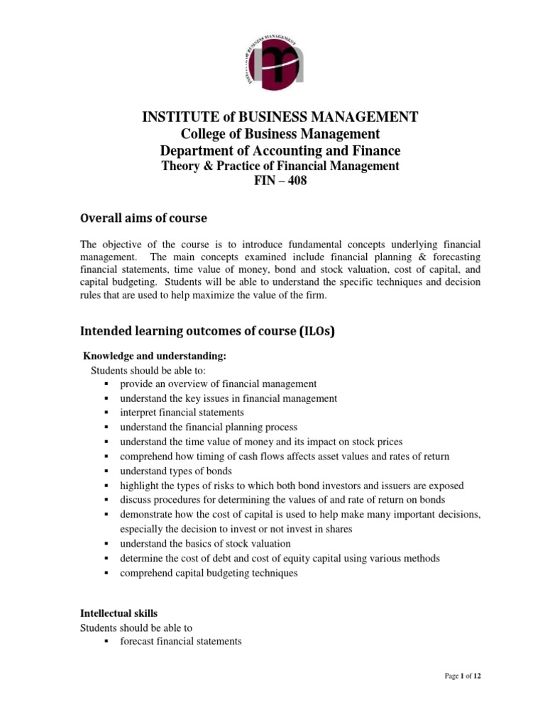 financial statements, time value of money, bond and stock valuation, cost of capital, and