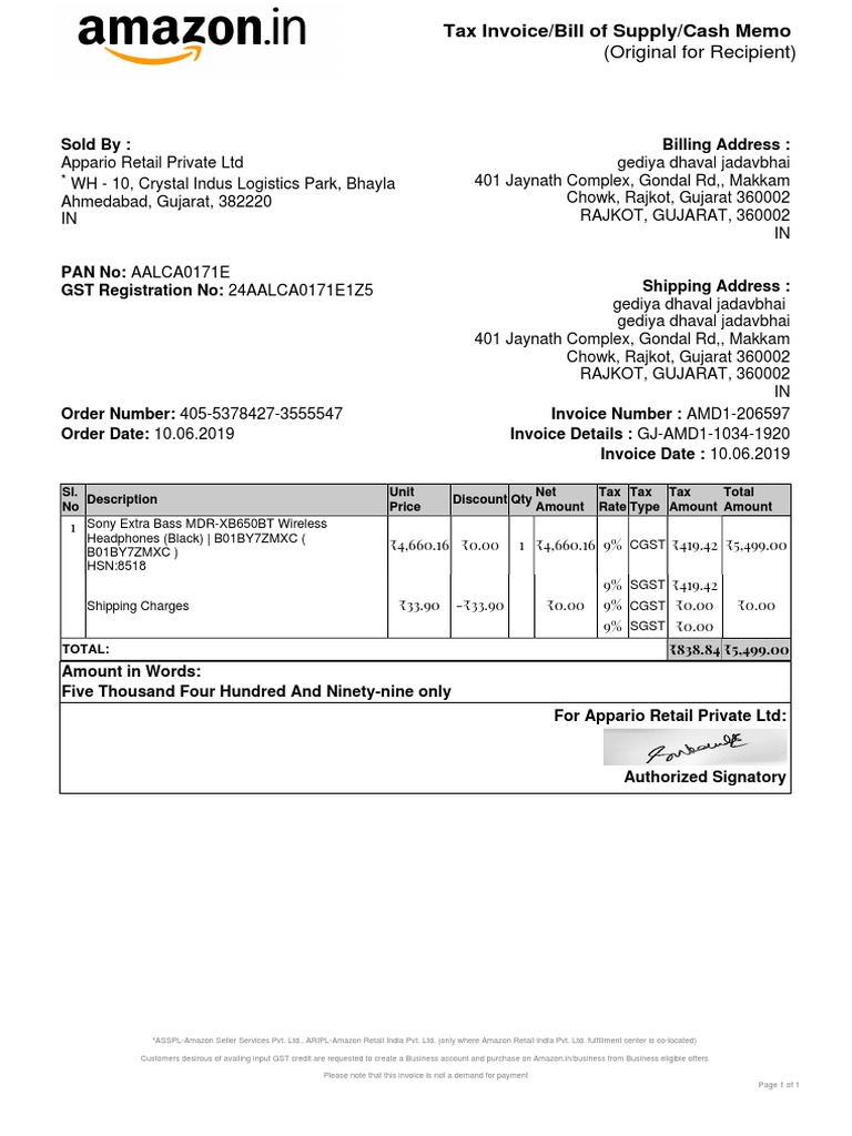 Order Date: 10.06.2019 Invoice Details : GJ-AMD1-1034-1920