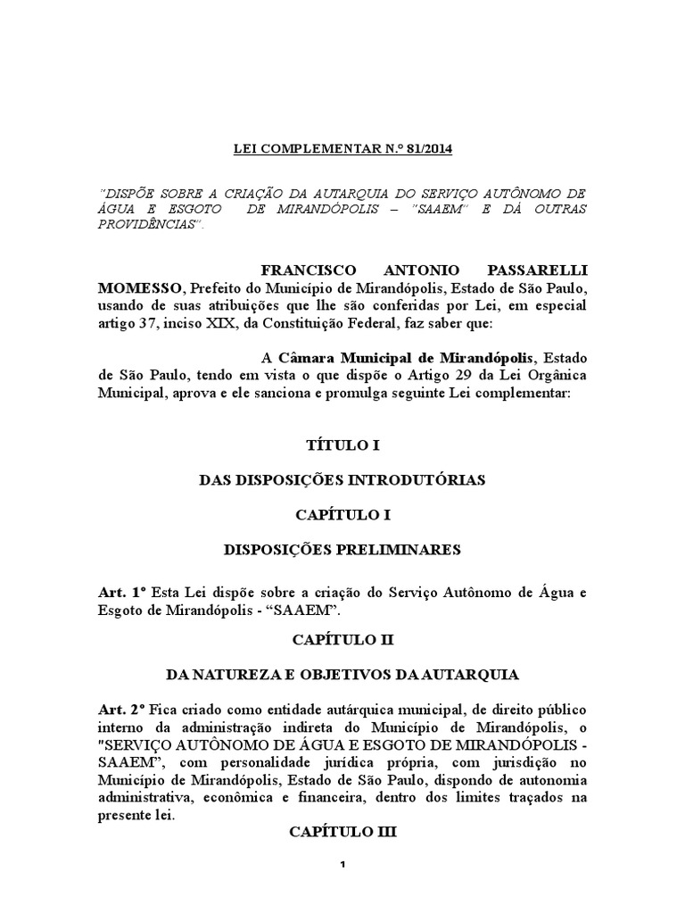 Art. 1º Esta Lei dispõe sobre a criação do Serviço Autônomo de Água e