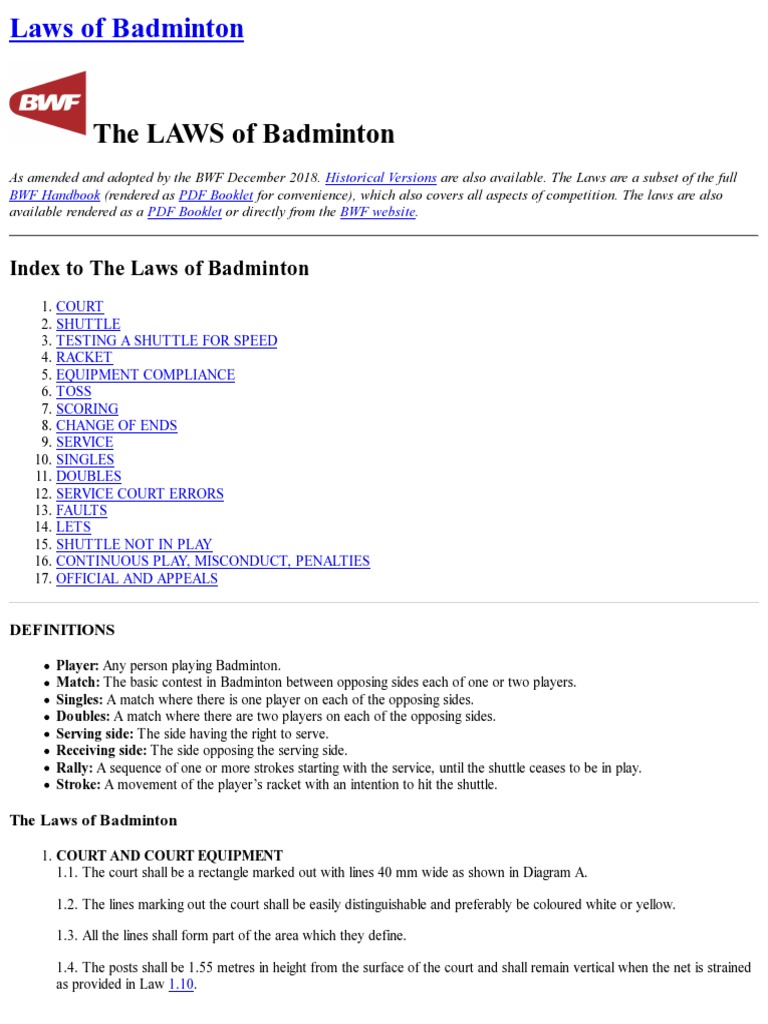 BWF Handbook (rendered as PDF Booklet for convenience), which also covers all aspects of competition. The laws are also