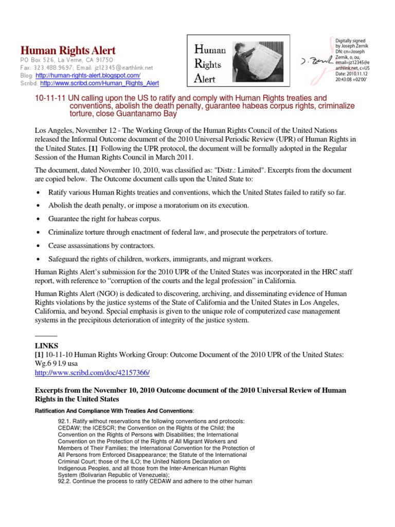 10-11-11 UN calling upon the US to ratify and comply with Human Rights treaties and conventions, abolish the death penalty, guarantee habeas corpus rights, criminalize torture, close Guantanamo Bay