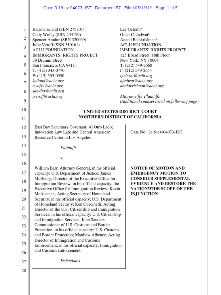 1 2 3 4 5 6 7 8 9 10 11 12 13 14 15 16 17 18 19 20 21 22 23 24 25 26 27 28 1 Mot. to Supplement the Record and Restore Nationwide Relief Case No.: 3:19-cv-04073 TO RESPONDENTS AND THEIR ATTORNEYS OF RECORD: PLEASE TAKE NOTICE that Plaintiffs East Bay Sanctuary Covenant, Al Otro Lado, Innovation Law Lab, and Central American Resource Center of Los Angeles hereby move the Court to consider supplemental evidence in support of the necessary scope of preliminary injunctive relief to remedy Plaintiffs’ harms, and to restore the nationwide scope of the preliminary injunction entered on July 24, 2019.