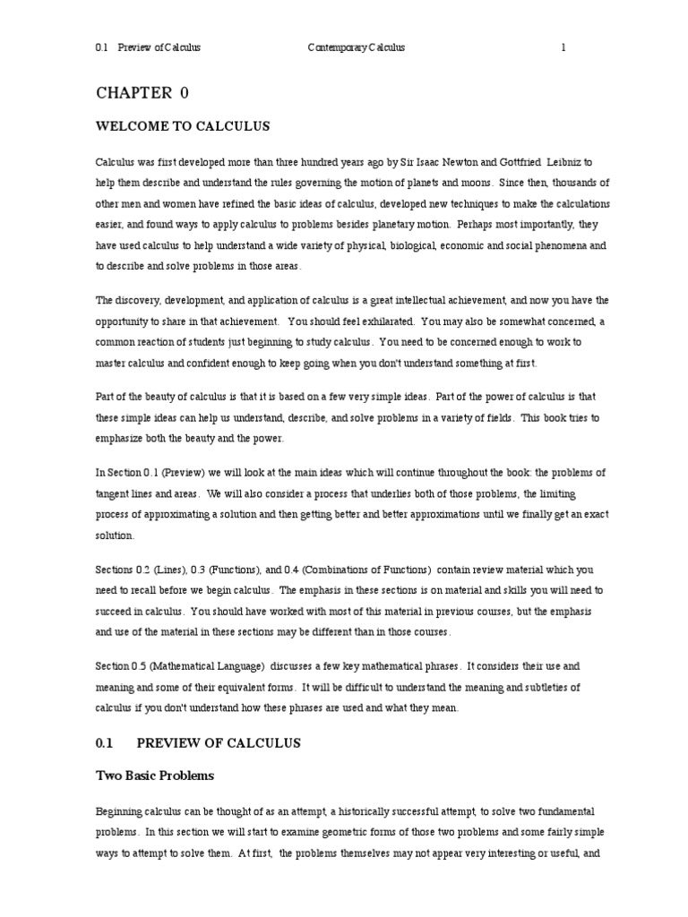 Sections 0.2 (Lines), 0.3 (Functions), and 0.4 (Combinations of Functions) contain review material which you