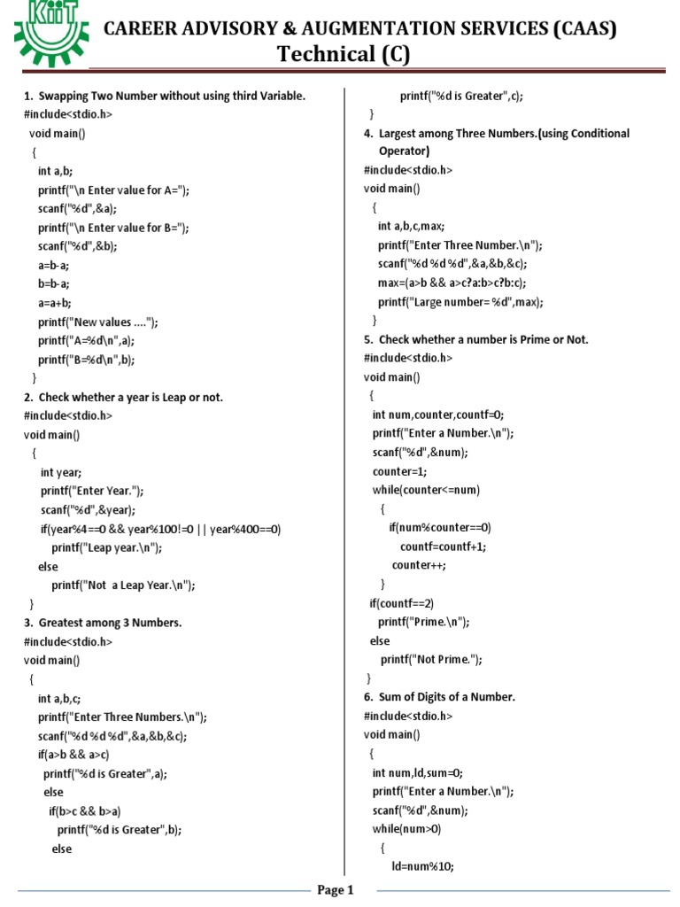 1. Swapping Two Number without using third Variable. printf("%d is Greater",c);