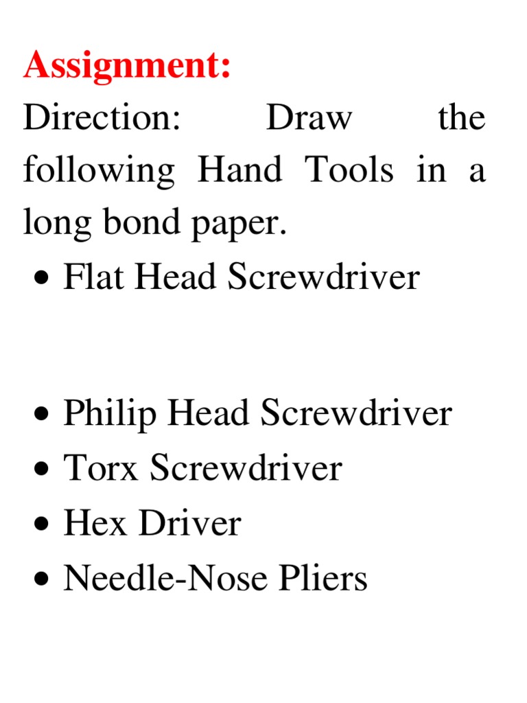 following Hand Tools in a long bond paper. Flat Head Screwdriver Philip Head Screwdriver Torx Screwdriver Hex Driver Needle-Nose Pliers Wire-Cutter Tweezers Part Retriever Flashlight