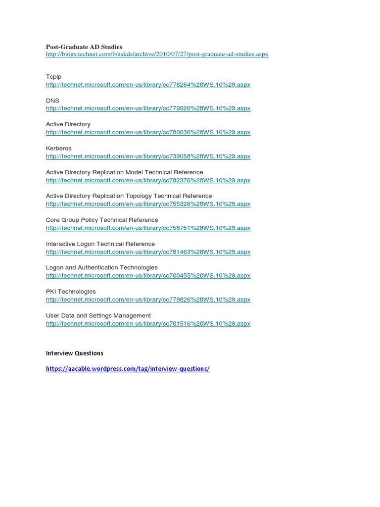 This document provides a list of technical references and resources for further studying concepts related to Active Directory including TCP/IP, DNS, Active Directory itself, Kerberos, replication models, group policy, logon technologies, PKI, and user data management. It also includes an unrelated link to interview questions. The resources will help expand knowledge of Active Directory and related technologies beyond initial training.