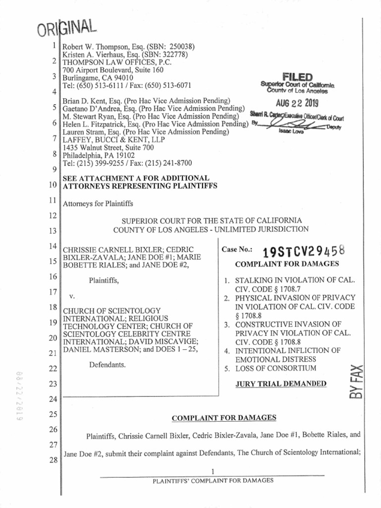 Carnell Bixler Et Al. vs. Scientology, Miscavige, Masterson: Complaint