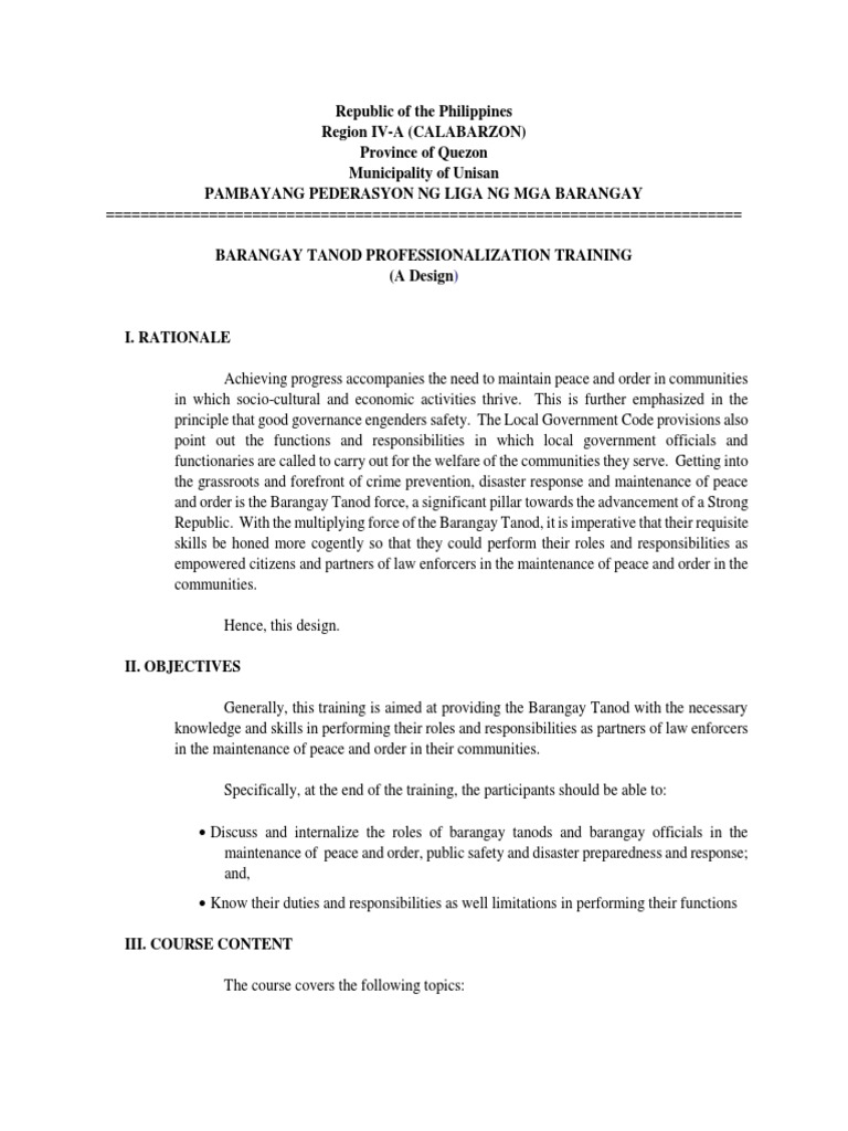 Generally, this training is aimed at providing the Barangay Tanod with the necessary