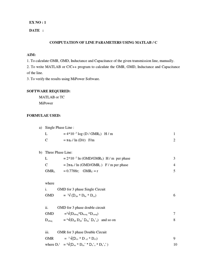 2. To write MATLAB or C/C++ program to calculate the GMR, GMD, Inductance and Capacitance