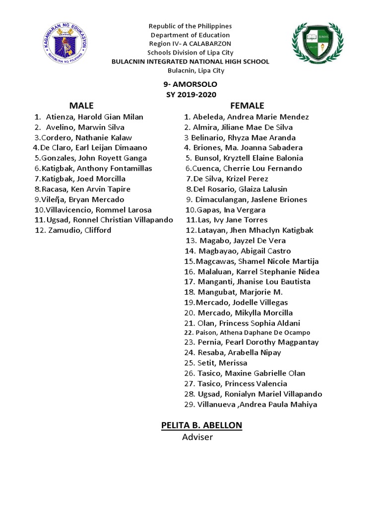 1. Atienza, Harold Gian Milan 1. Abeleda, Andrea Marie Mendez