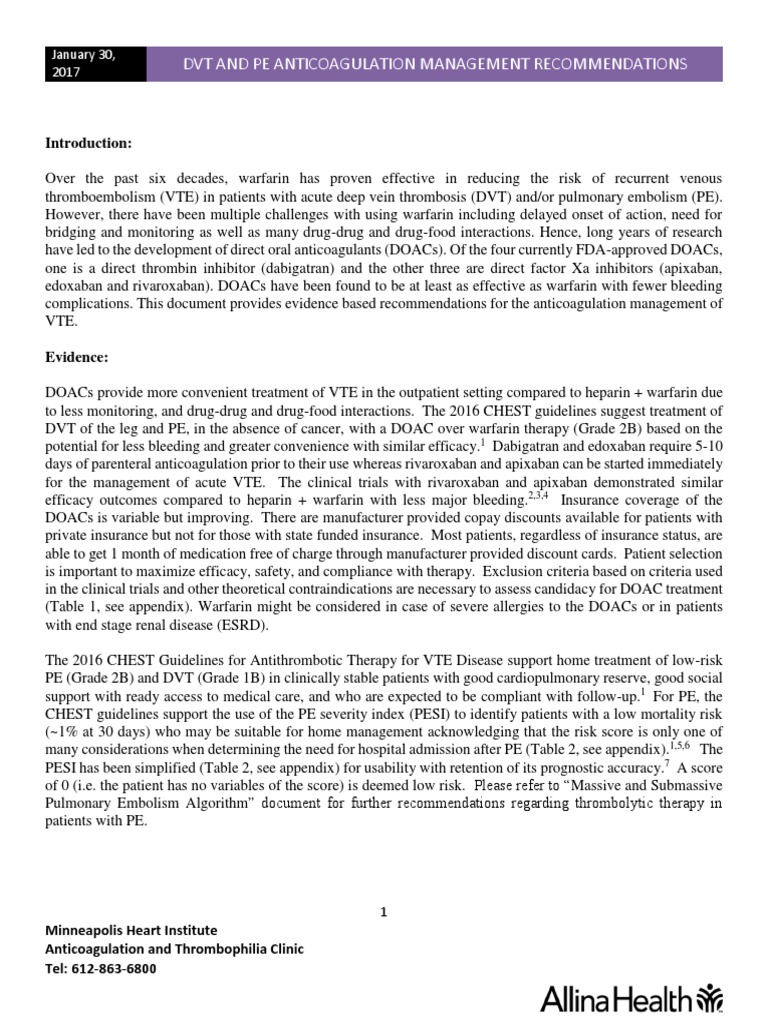 2017 DVT AND PE ANTICOAGULATION MANAGEMENT RECOMMENDATIONS