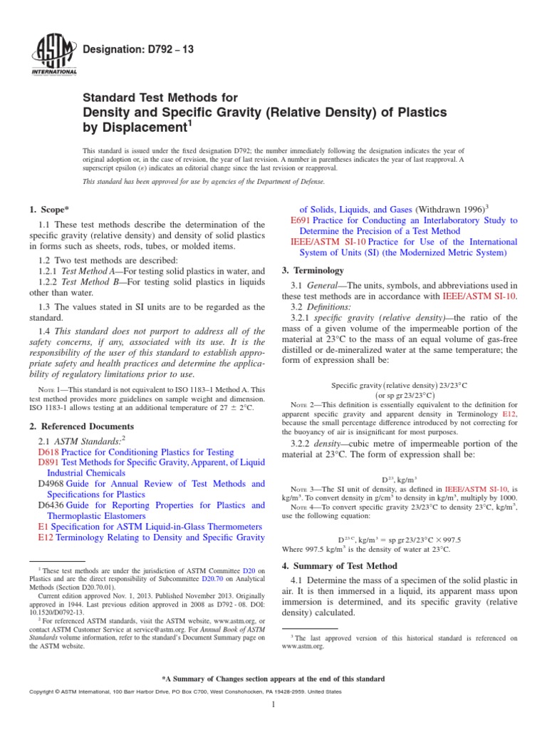 approved in 1944. Last previous edition approved in 2008 as D792 - 08. DOI: immersion is determined, and its specific gravity (relative