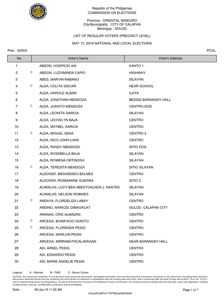 LIST OF REGULAR VOTERS (PRECINCT LEVEL)