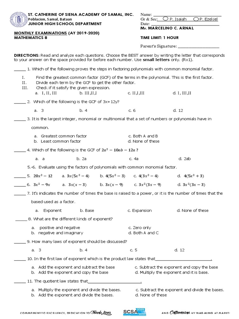 {1st Monthly Tests, Math 8, pg.2, 8-Ezekiel & 8- Isaiah}