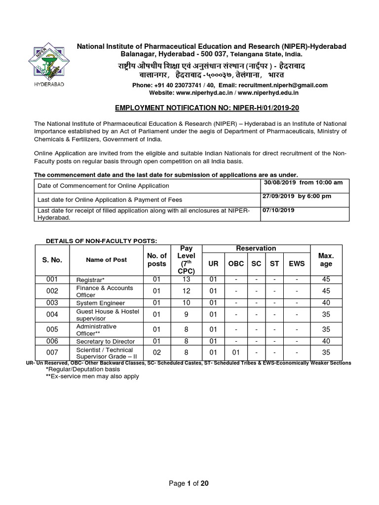 NIPER Hyderabad Job Openings