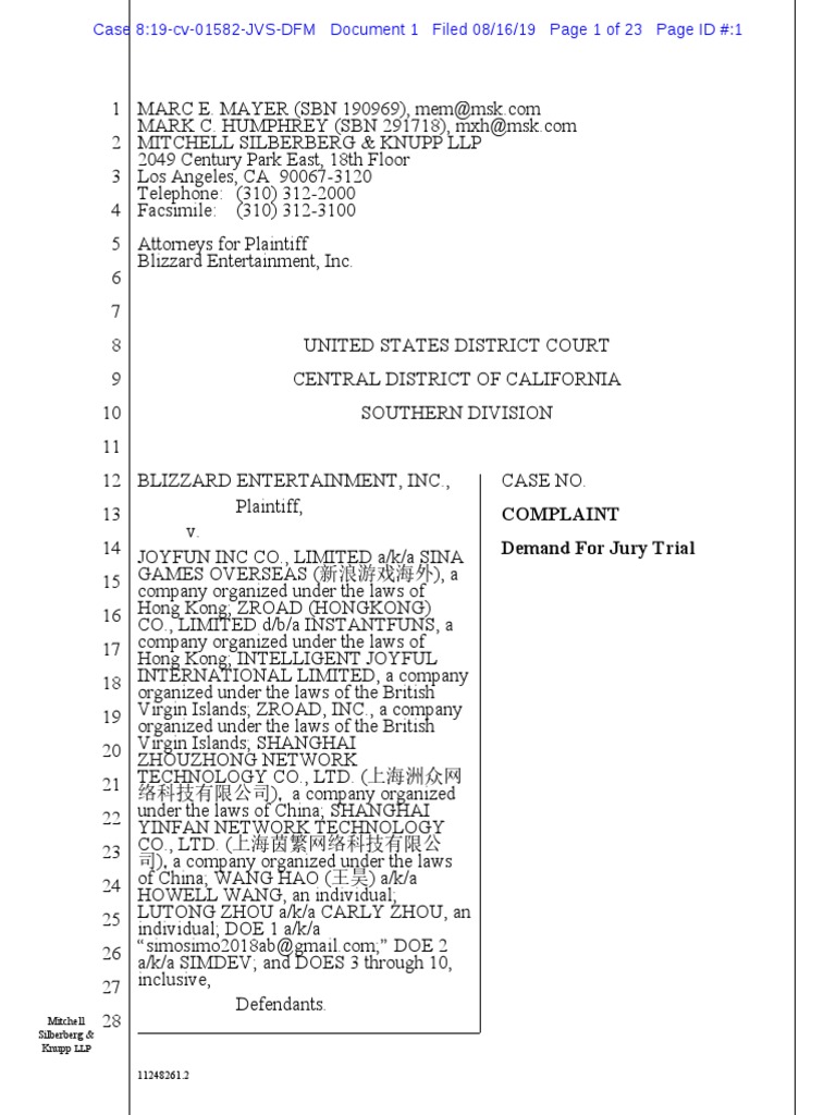 Blizzard Entertainment vs. Joyfun Inc/Sina Games
