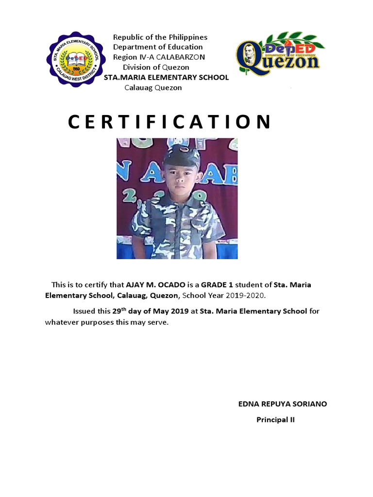 This is to certify that AJAY M. OCADO is a GRADE 1 student of Sta. Maria