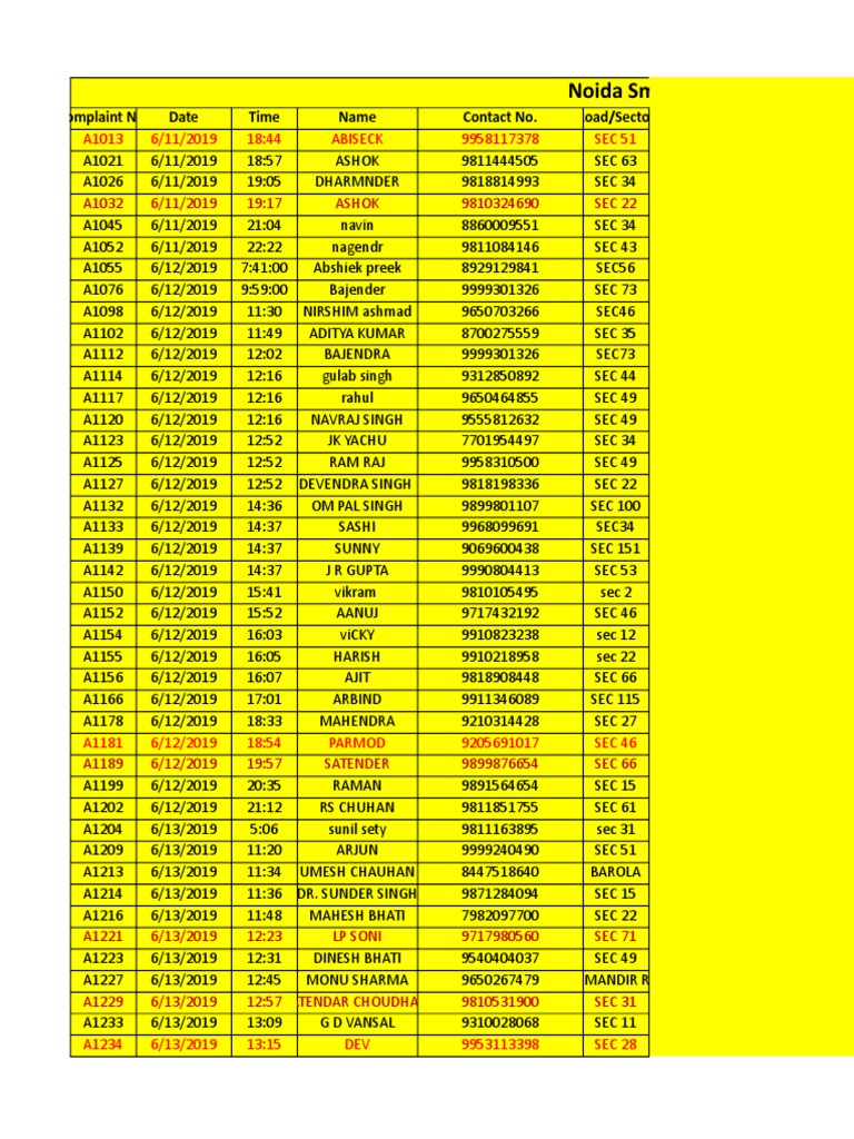Complaint No. Date Time Name Contact No. Road/Sector