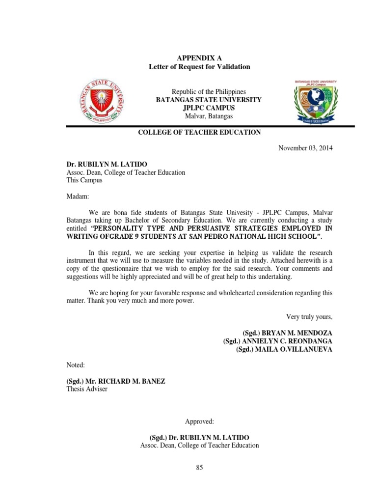 Letter of Request for Validation