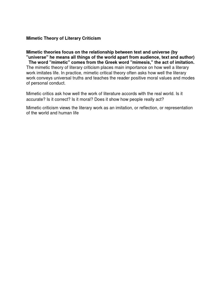 work imitates life. In practice, mimetic critical theory often asks how well the literary