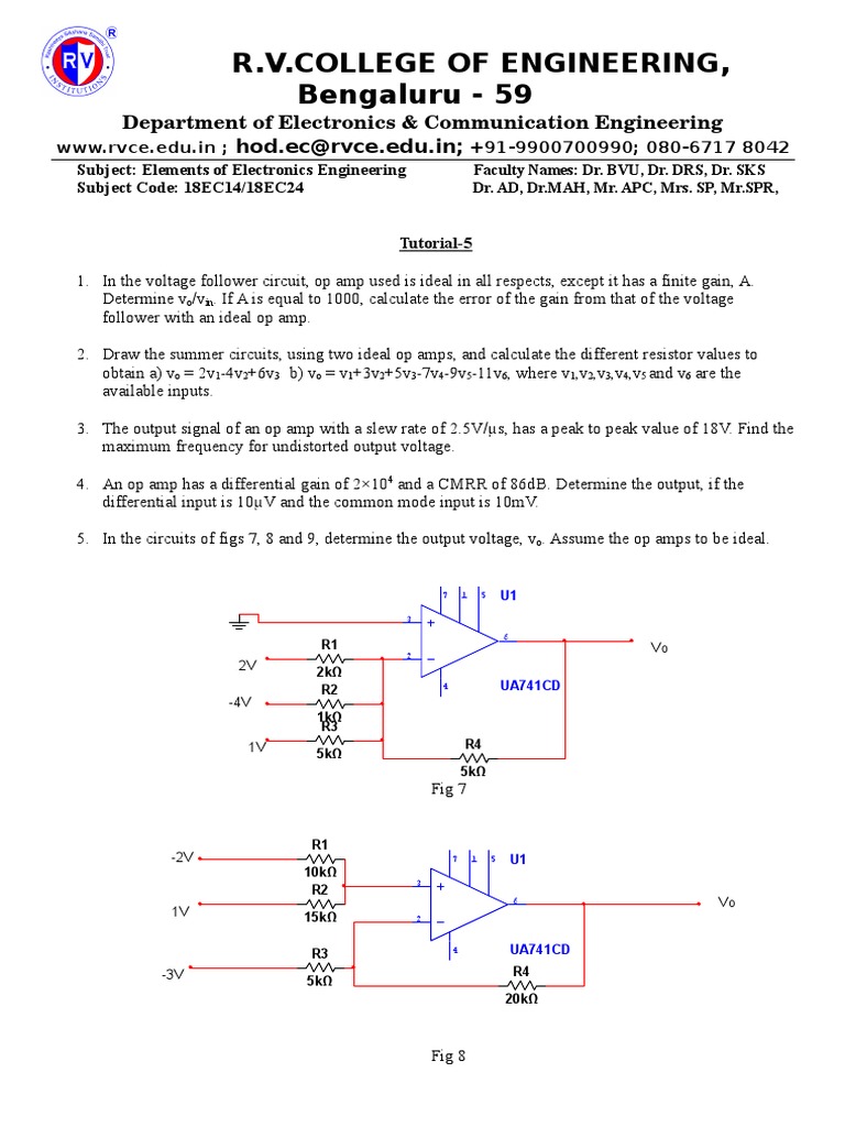 5. In the circuits of figs 7, 8 and 9, determine the output voltage, vo. Assume the op amps to be ideal.
