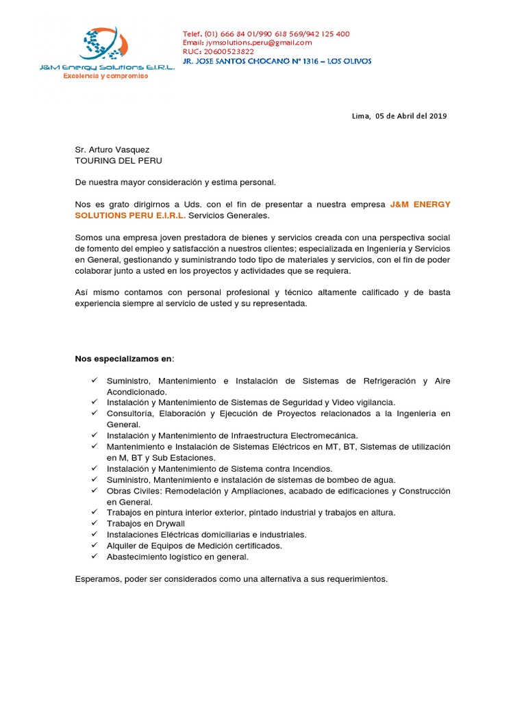 Nos es grato dirigirnos a Uds. con el fin de presentar a nuestra empresa J&M ENERGY