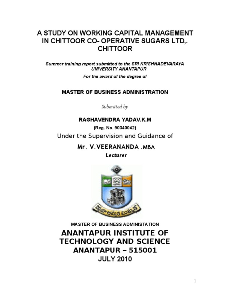 1. Working Capital ratio of the chittoor Co-operative Sugar Ltd is decreasing