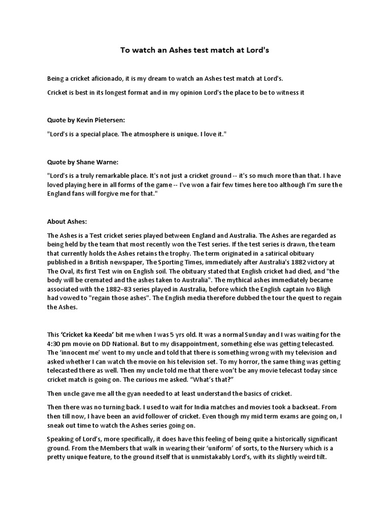 Being a cricket aficionado, it is my dream to watch an Ashes test match at Lord's.