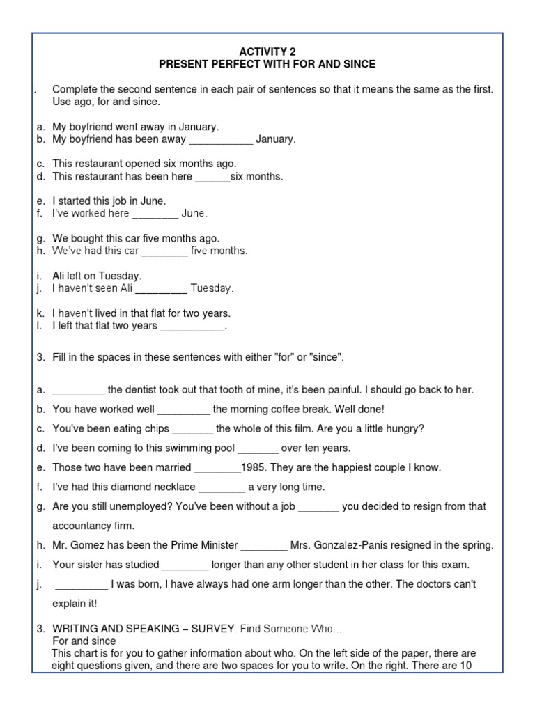 2. ____________ you ___________ ( see ) Mary and Tom FOR / SINCE Tuesday, Alan ?