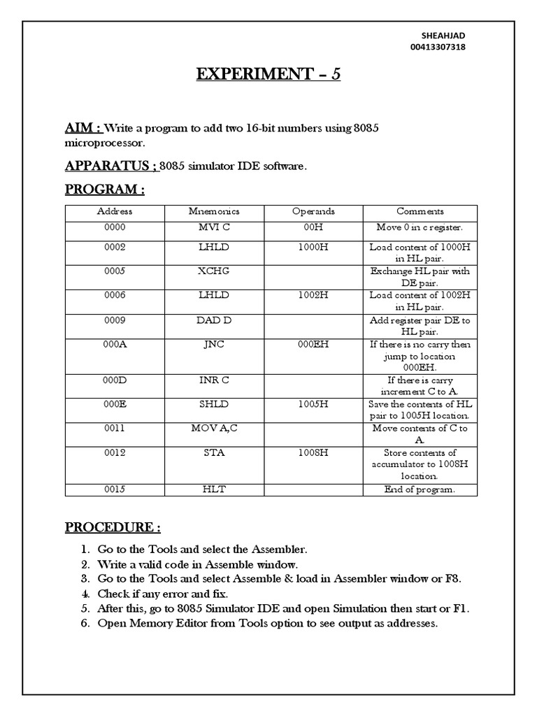 AIM : Write a program to add two 16-bit numbers using 8085