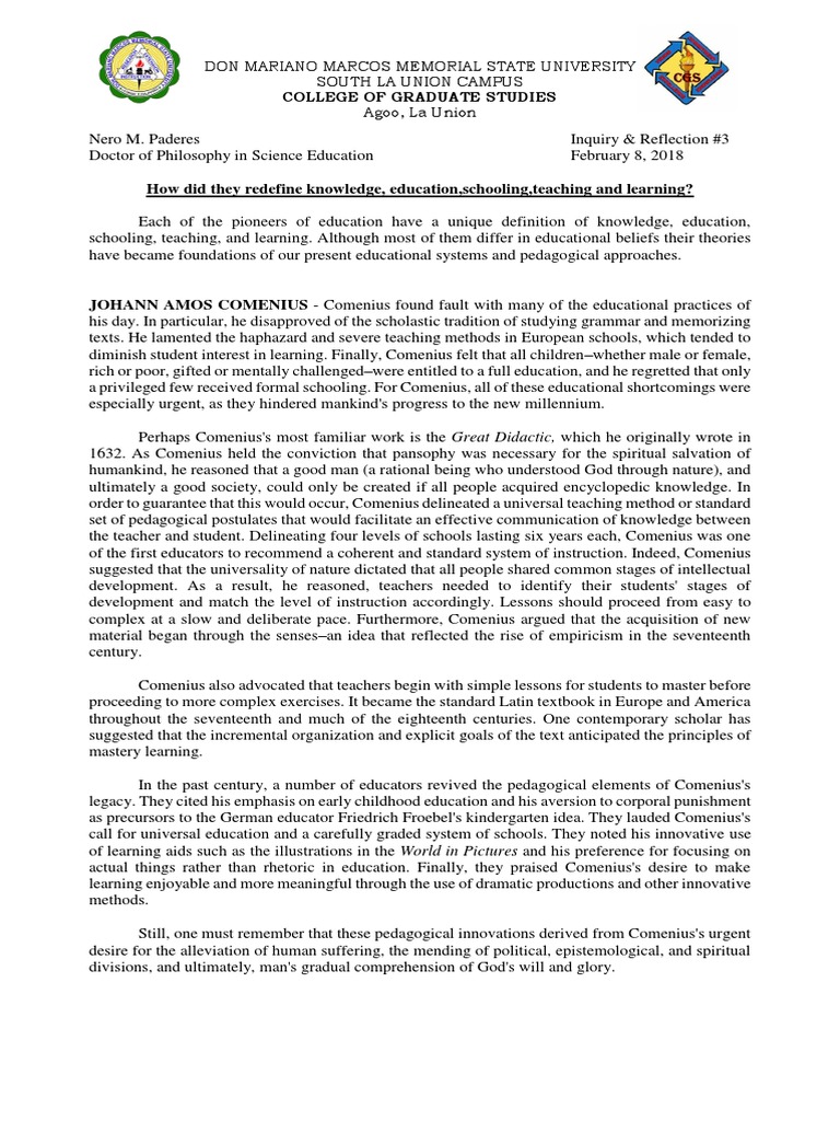 Each of the pioneers of education have a unique definition of knowledge, education,