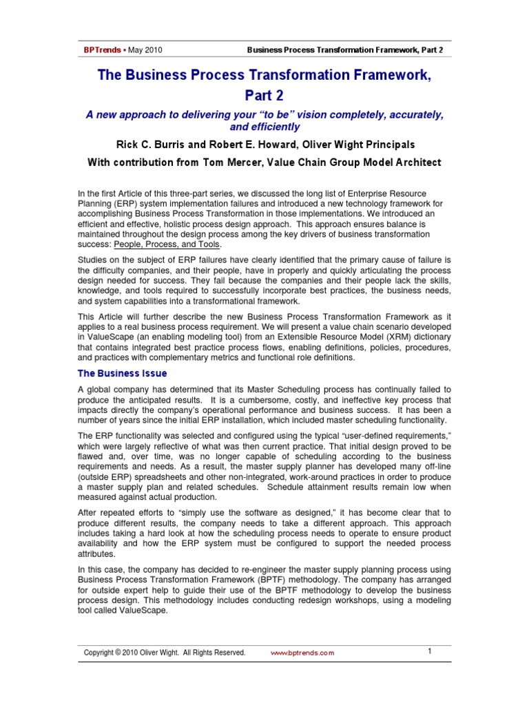 This Article will further describe the new Business Process Transformation Framework as it