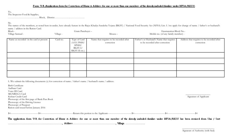 The application form V-R for Correction of Name & Address for one or more than one member of the already included families under NFSA/RKSY has been received from Shri / Smt