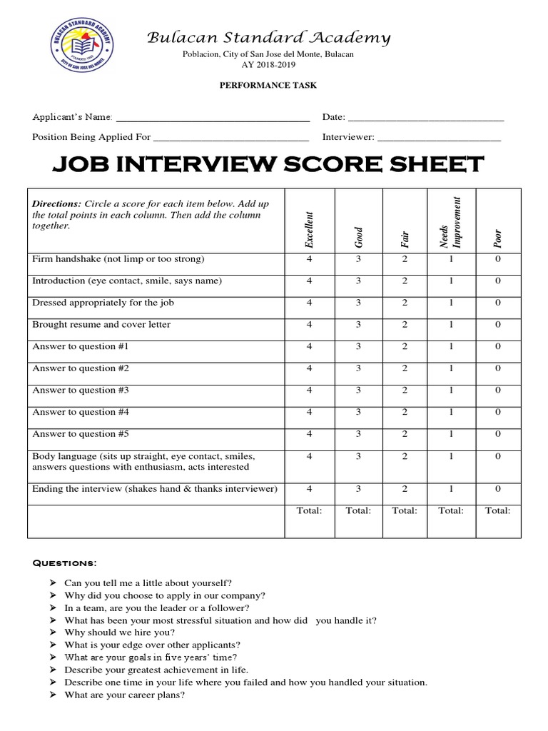 JOB INTERVIEW SCORE SHEET