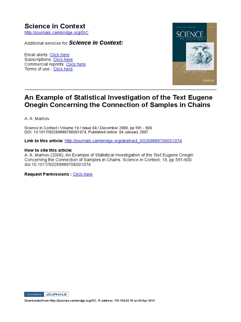 A. A. Markov (2006). An Example of Statistical Investigation of the Text Eugene Onegin