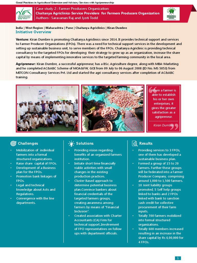 Citation: Saravanan Raj, and Jyoti Todd (2018). Farmer Producers Organization-Chaitanya Agriclinics-Service