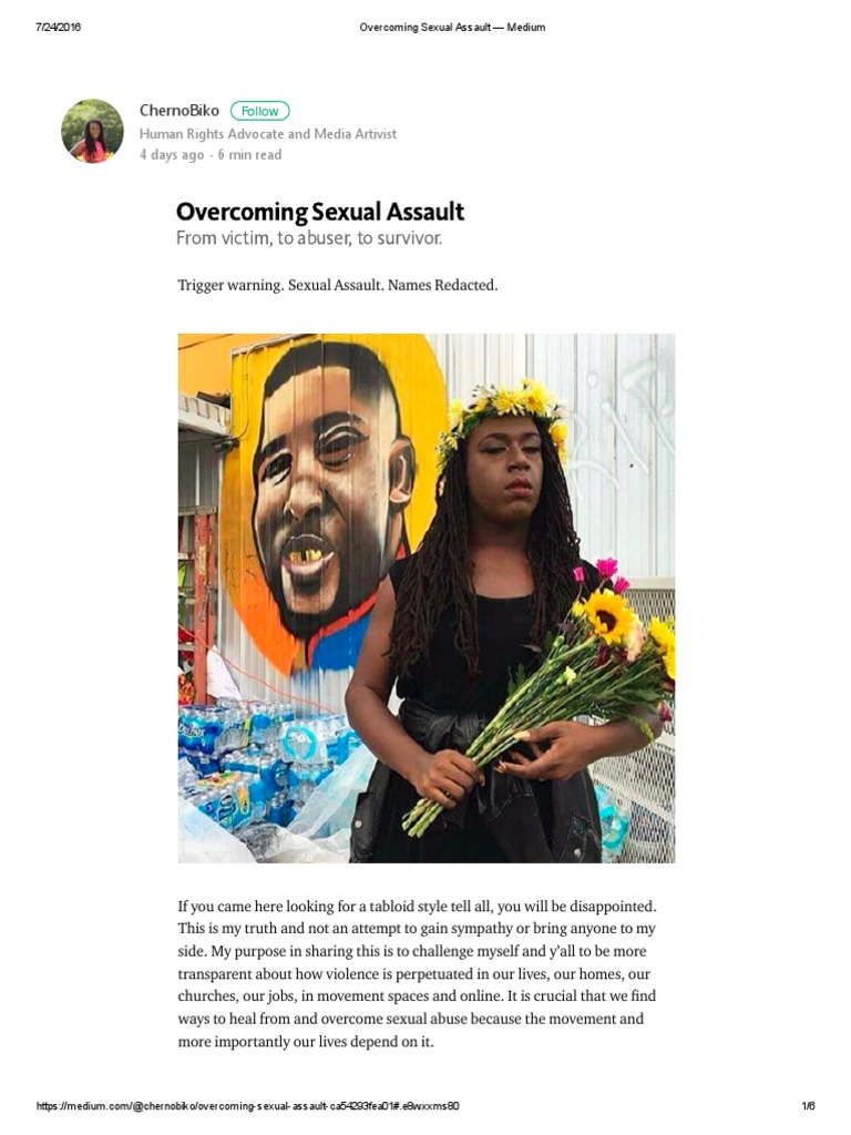 The document is a personal essay by ChernoBiko about overcoming sexual assault. It describes being sexually abused as a child for years. As an adult, the author fell in love and had sex for …